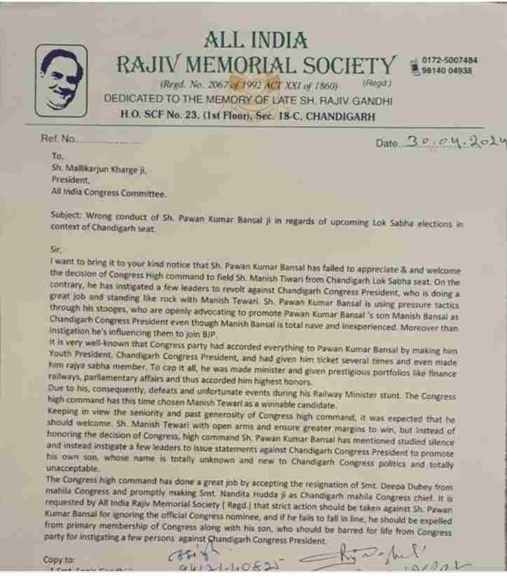 ऑल इंडिया राजीव मैमोरियल सोसाइटी चंडीगढ़ के अध्यक्ष राज नागपाल की अध्यक्षता में हुई इस बैठक में शामिल हुए सोसाइटी के पदाधिकारियों ने आरोप लगाया कि पवन कुमार बंसल व उनके बेटे मनीष बंसल चंडीगढ़ के कांग्रेसियों को मनीष तिवारी के विरोध में पार्टी छोड़ने तथा भाजपा ज्वाइन करने के लिए उकसा रहे हैं। साथ ही लोकसभा चुनाव में कांग्रेस उम्मीदवार मनीष तिवारी की स्थिति को कमजोर करने की लगातार कोशिशें कर रहे हैं। राजीव मैमोरियल सोसाइटी चंडीगढ़ के अध्यक्ष राज नागपाल ने तो चेतावनी तक दे डाली कि यदि पवन कुमार बंसल व मनीष बंसल ने अपनी इस कार्रवाई को न रोका तो सोसाइटी बंसल के खिलाफ सड़क पर उतर पड़ेगी। नागपाल ने बताया कि पवन कुमार बंसल व उनके बेटे मनीष बंसल को पार्टी से निकालने की मांग को लेकर राजीव मैमोरियल सोसाइटी चंडीगढ़ की तरफ से कांग्रेस हाईकमान को पत्र भी भेज दिए गए हैं। देखिए पत्र में क्या-क्या लिखा गया 👇