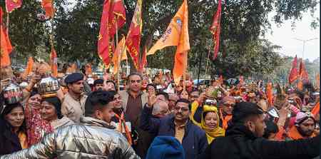 CHANDIGARH, 15 JANUARY: चंडीगढ़ प्रदेश भाजपा के पूर्व अध्यक्ष और हिमाचल प्रदेश भाजपा के सह-प्रभारी संजय टंडन आज चंडीगढ़, सेक्टर-23 से सेक्टर-34 के प्रदर्शनी मैदान तक निकाली गई कलश यात्रा में शामिल हुए। यात्रा के दौरान संजय टंडन ने कहा कि वह स्वयं को सौभाग्यशाली मानते हैं कि वह अपने जीवन में अयोध्या के श्रीराम मंदिर में श्रीराम लला के प्राण प्रतिष्ठा उत्सव का हिस्सा बन रहे हैं। उन्होंने कहा की प्राण प्रतिष्ठा उत्सव से पूर्व निकाली गई यह कलश यात्रा और प्रत्येक घड़ी हर जनमानस को प्रभु श्रीराम की सेवा का मौका प्रदान कर रही है। उन्होंने कहा कि करीब पांच सौ वर्ष बाद 22 जनवरी 2024 को सनातन धर्म की इस विजयी घड़ी का साक्षी बनने का सौभाग्य जन-जन के पास है। इसके बाद संजय टंडन ने जय श्रीराम के जय घोष के साथ सेक्टर-34 तक निकाली गई कलश यात्रा को पूरा किया और अपने पग-पग पर राम नाम को आत्मसात किया।