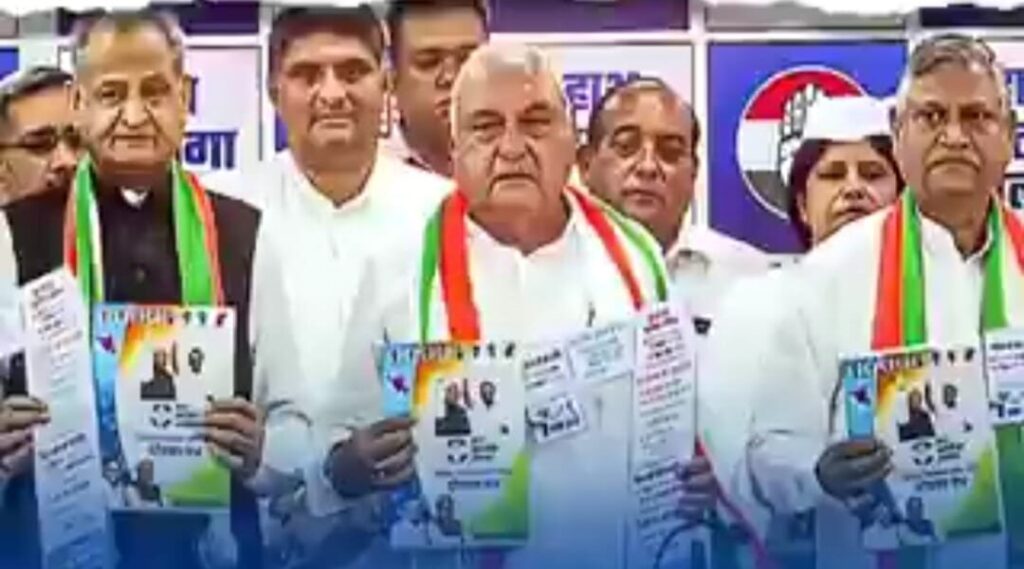 घोषणापत्र को जारी करने के अवसर पर हरियाणा चुनाव के सीनियर ऑब्जर्वर व राजस्थान के पूर्व मुख्यमंत्री अशोक गहलोत, हरियाणा के नेता प्रतिपक्ष भूपेंद्र सिंह हुड्डा, प्रदेशाध्यक्ष चौधरी उदयभान, कार्यकारी अध्यक्ष जितेंद्र भारद्वाज, मीडिया प्रभारी चाँदवीर हुड्डा, एआईसीसी के सेक्रेटरी मनोज चौहान, एआईसीसी से हरियाणा मीडिया प्रभारी आलोक शर्मा और घोषणा पत्र समिति की चेयरपर्सन गीता भुक्कल विशेष तौर पर मौजूद रहीं।