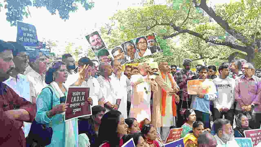 CHANDIGARH, 5 SEPTEMBER: तमिलनाडु के मंत्री उदयनिधि स्टालिन द्वारा हिंदू धर्म को लेकर दिए गए अपमानजनक बयान और कांग्रेसी नेताओं मयंक खड़गे व के अलागिरी द्वारा स्टालिन का समर्थन किए जाने के खिलाफ आज यहां चंडीगढ़ प्रदेश भाजपा अध्यक्ष अरुण सूद के नेतृत्व में सैकड़ों भाजपा कार्यकर्ताओं ने कड़ी नाराजगी जताते हुए विरोध मार्च का आयोजन किया। साथ ही I.N.D.I.A. का गठबंधन का पुतला फूंका।