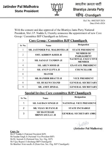 मल्होत्रा ने चंडीगढ़ प्रदेश भाजपा की कोर कमेटी बनाई