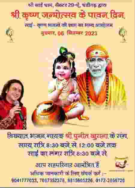 श्री साईं धाम के प्रबंधकों ने बताया कि श्रीकृष्ण जन्माष्टमी महोत्सव के दौरान विख्यात भजन गायक पुनीत खुराना भजन गायन करेंगे। कार्यक्रम 6 सितम्बर को रात 8.30 बजे से बाद मध्यरात्रि तक चलेगा। इस दौरान अटूट लंगर भी बरताया जाएगा।