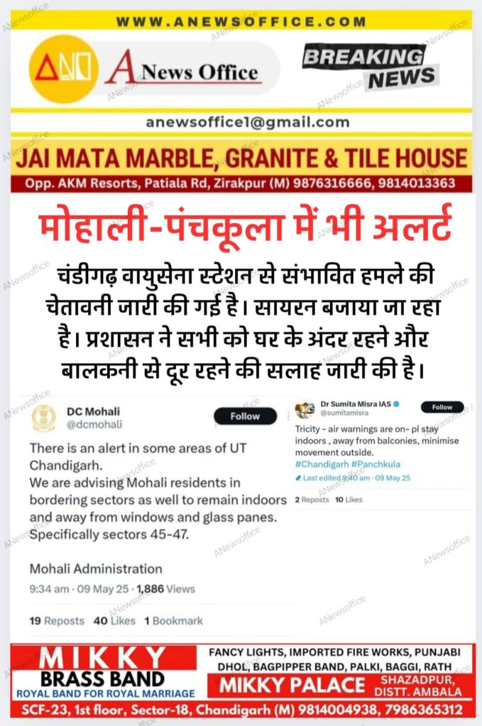 WAR UPDATE: मोहली पंचकुला में भी अलर्ट | Chandigarh Haryana Punjab | By Neeraj Adhikari चंडीगढ़ वायुसेना स्टेशन से संभावित हमले की चेतावनी जारी की गई है। सायरन बजाया जा रहा है। प्रशासन ने सभी को घर के अंदर रहने और बालकनी से दूर रहने की सलाह जारी की है।